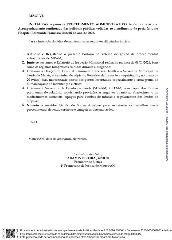 O Ministério Público do Estado do Amazonas (MPAM) através da 1ª Promotoria de Justiça da Comarca do Município por meio de Portaria instaurou um Procedimento Administrativo para fiscalizar o Hospital Geral Raimunda Francisca Dinelli do Município de Maués, a 258 quilômetros de Manaus, durante todo o ano de 2026. A medida segundo o teor do documento publicado pelo MPAM, foi tomada após uma inspeção realizada em 8 de janeiro de 2026, que identificou problemas graves na referida unidade hospitalar, como falhas na manutenção elétrica, falta de climatização na recepção e ausência de insumos básicos.