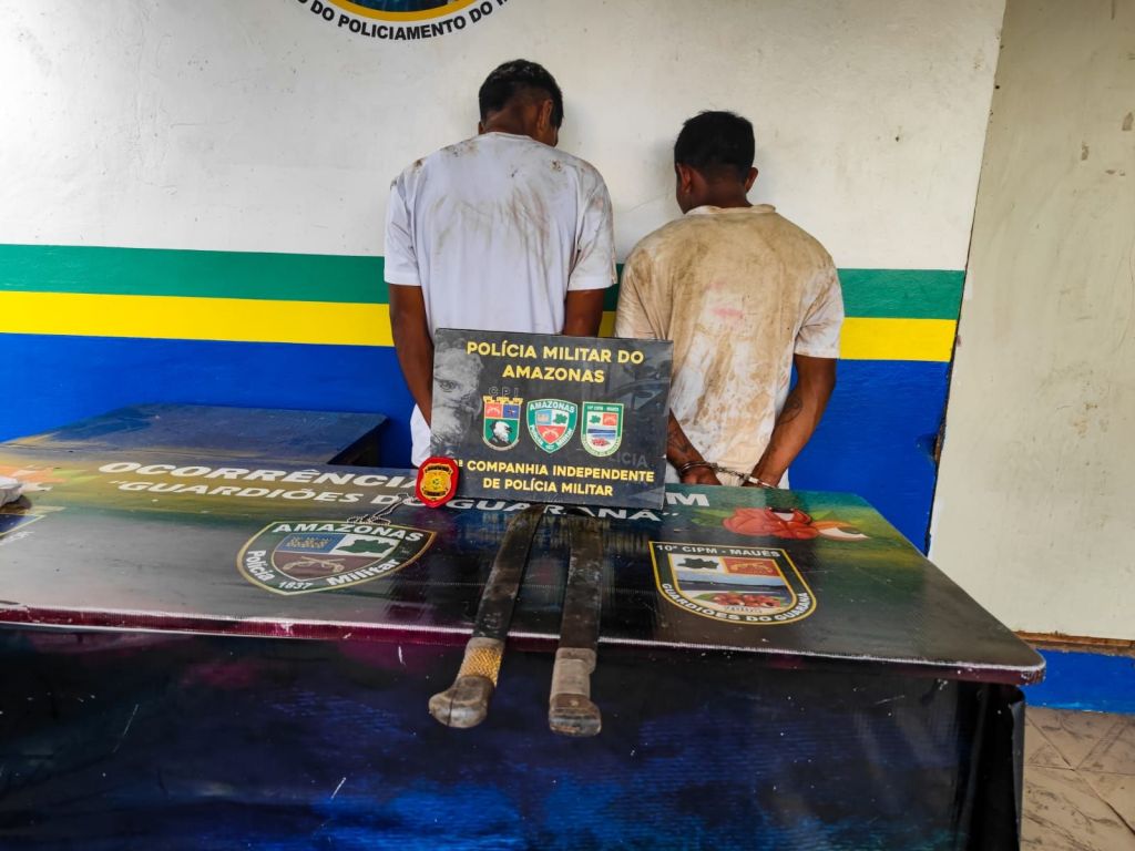 Durante a Ocorrência os suspeitos foram localizados na Estrada Maués-Miri, e durante Abordagem e Revista foram encontrados com os mesmos, (02) terçados. Ainda durante a ocorrência foi realizado a consulta dos nomes dos indivíduos, e foi confirmado Mandados de prisão em aberto para ambos. Diante dos Fatos, os dois homens foram encaminhados para a 48ª Delegacia Interativa de Polícia Civil no centro de Maués, para serem realizados todos os Procedimentos Cabíveis.
