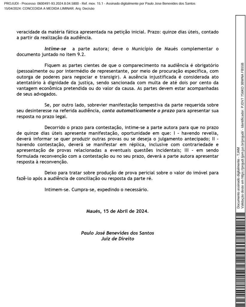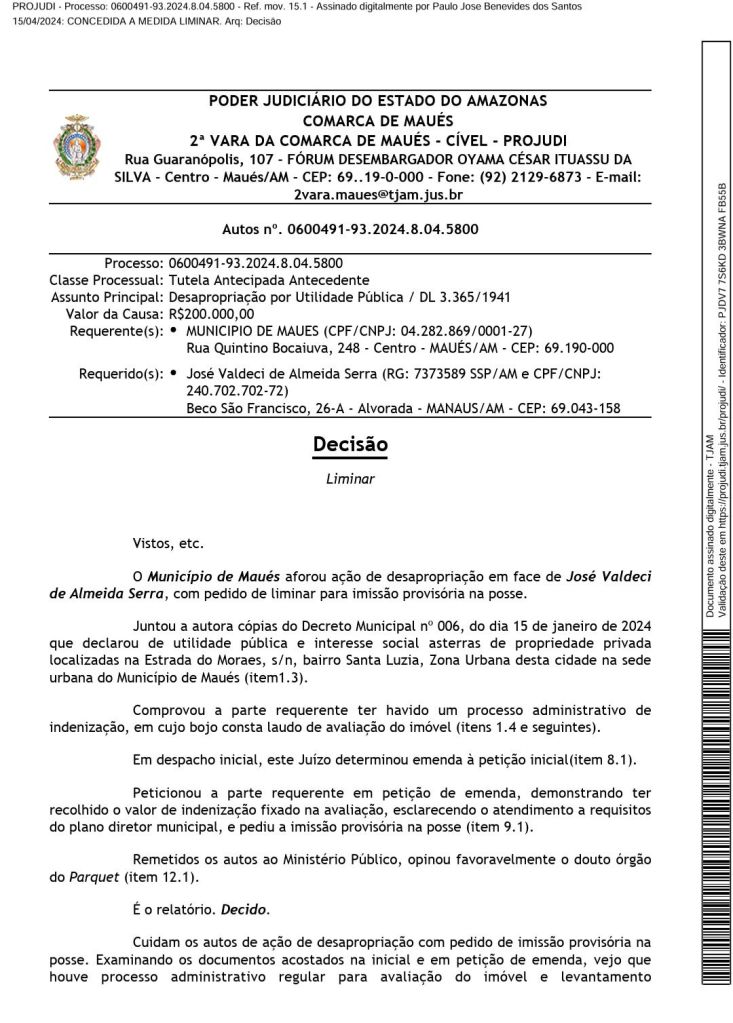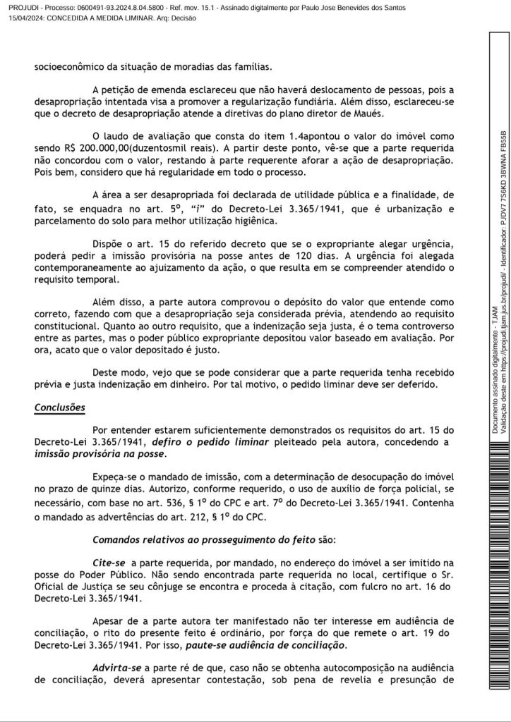 A Decisão do Juiz informa ainda o que o valor de R$ 200 mil reais foram depositados para o dono da terra desapropriada. “Além disso, a parte autora (no caso a Prefeitura de Maués) comprovou o depósito do valor que entende como correto, fazendo com que a desapropriação seja considerada prévia, atendendo ao requisito constitucional.